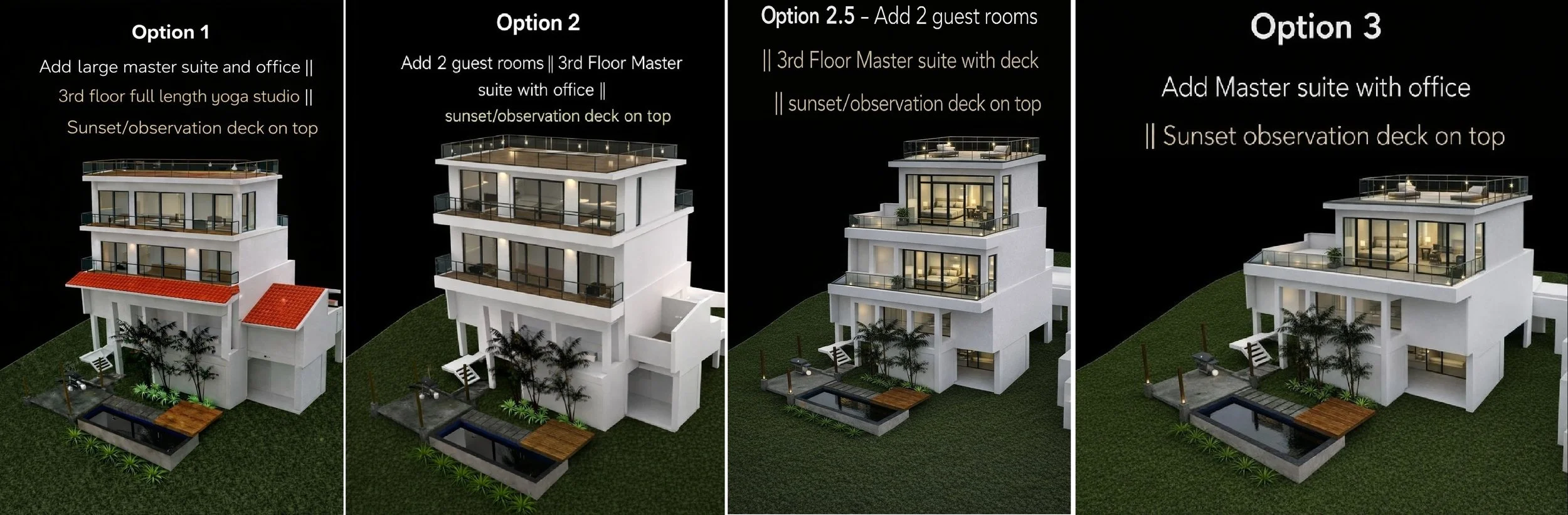 Conceptual build-up options have been explored to illustrate how additional floors could unlock sunset, ocean, canopy, and mountain views. All concepts are non-permitted and illustrative only, intended to demonstrate feasibility and long-term upside..